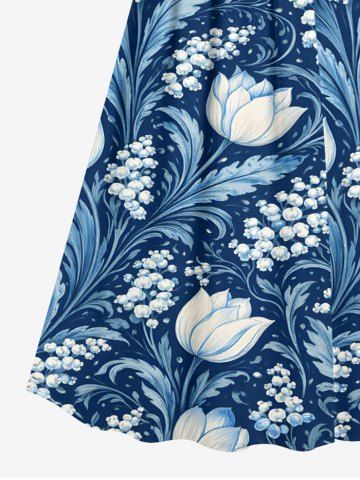 Plus Size Flower Leaf Branch Print Hawaii Surplice A Line Cami Dress - Blue - 3x