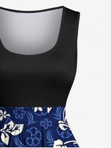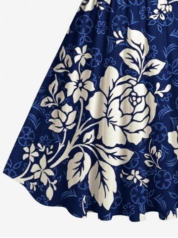 Plus Size Flower Leaf Branch Print Hawaii Vintage Swing A Line Dress - Navy Blue - 4x