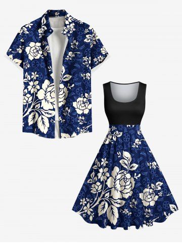 Plus Size Flower Leaf Branch Print Hawaii Vintage Swing A Line Dress - Navy Blue - 5x