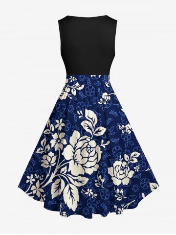 Plus Size Flower Leaf Branch Print Hawaii Vintage Swing A Line Dress - Navy Blue - 6x
