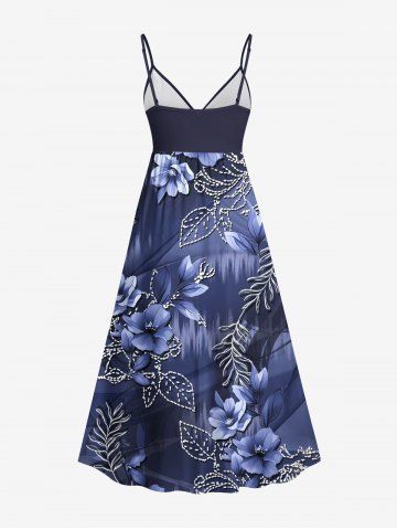 Plus Size Flower Leaf Branch Waterwave Print Hawaii Surplice A Line Cami Dress - Blue - M