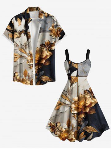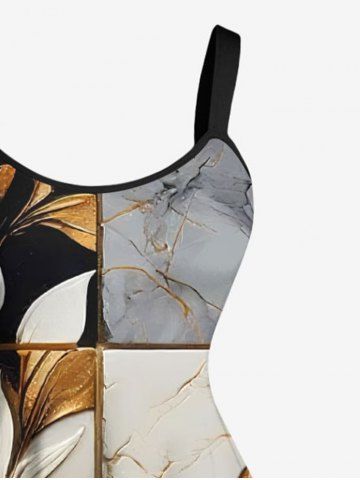 Plus Size Flower Leaf Colorblock Print Hawaii A Line Tank Dress - Gray - L