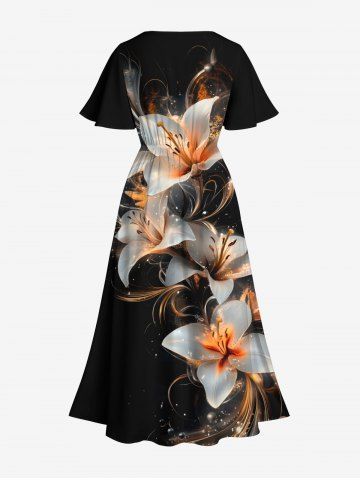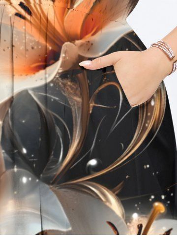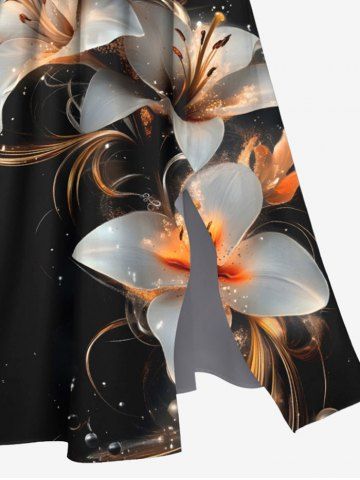Plus Size Flower Leaf Glitter 3D Print Split Hawaii Midi Dress - Black - M