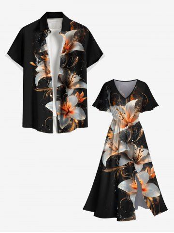 Plus Size Flower Leaf Glitter 3D Print Split Hawaii Midi Dress - Black - 1x