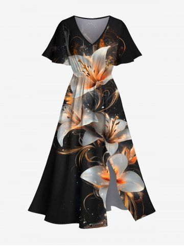 Plus Size Flower Leaf Glitter 3D Print Split Hawaii Midi Dress - Black - 4x