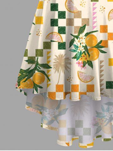 Plus Size Flower Leaf Lemon Colorblock Plaid Print Hawaii High Low Asymmetric Cami Dress - Deep Yellow - 2x