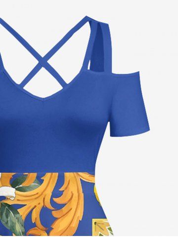 Plus Size Flower Leaf Lemon Print Hawaii Cold Shoulder Crisscross A Line Maxi Dress - Blue - L