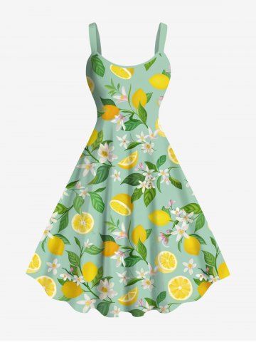 Plus Size Flower Leaf Lemon Print Hawaii Tank Dress - Green - 1x