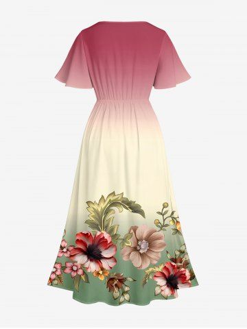 Plus Size Flower Leaf Ombre Print Hawaii Split Pocket A Line Midi Dress - Pink - Xs