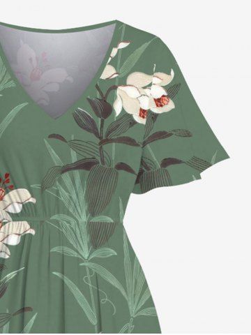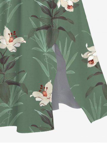 Plus Size Flower Leaf Plant Print Hawaii Split Pocket A Line Midi Dress - Green - Xxs