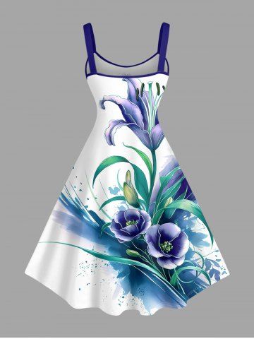 Plus Size Flower Leaf Plant Watercolor Print Hawaii A Line Dress - Concord - S