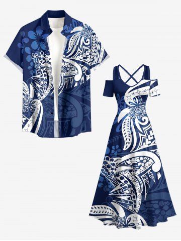 Plus Size Flower Leaf Print Cold Shoulder Crisscross Hawaii Maxi Dress - Deep Blue - 4x