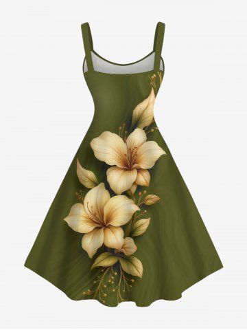Plus Size Flower Leaf Print Hawaii A Line Dress - Green - Xxs
