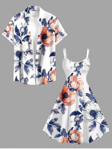 Plus Size Flower Leaf Print Hawaii A Line Dress - White - 1x