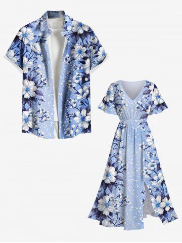 Plus Size Flower Leaf Print Hawaii Split Pocket A Line Midi Dress - Powder Blue - 6x