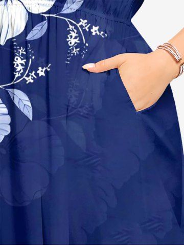 Plus Size Flower Leaf Print Hawaii Split Pocket A Line Midi Dress - Deep Blue - Xxs