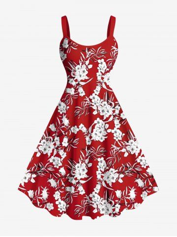 Plus Size Flower Leaf Print Hawaii Tank Dress - Red - 1x