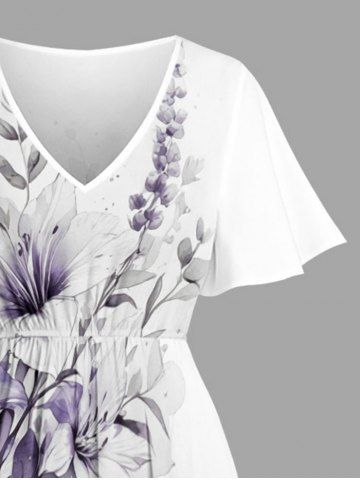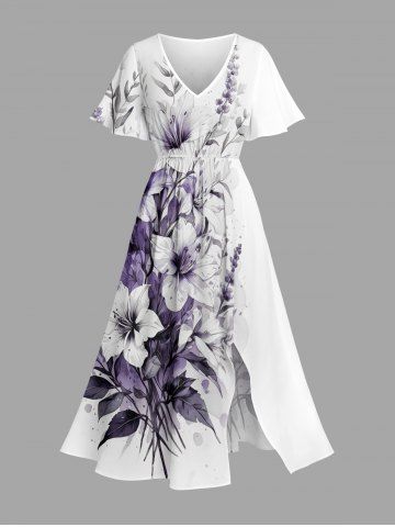 Plus Size Flower Leaf Print Split Hawaii Midi Dress - Milk White - L