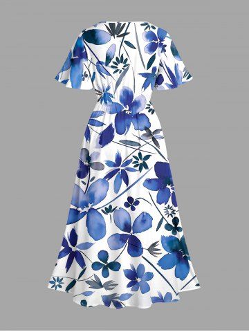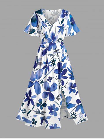 Plus Size Flower Leaf Print Split Hawaii Midi Dress - Blue - M