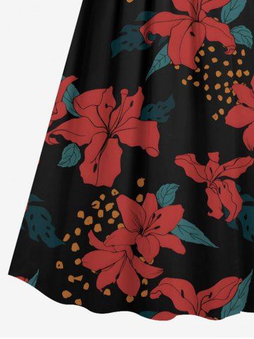 Plus Size Flower Leaf Spotted Print Hawaii Surplice A Line Cami Dress - Red - L
