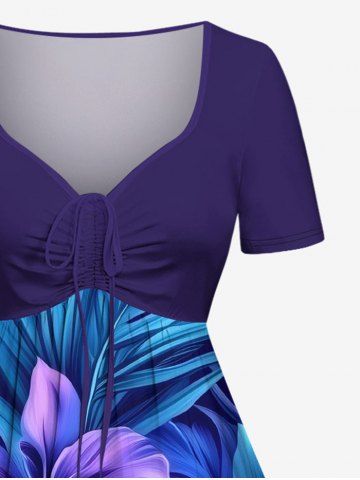 Plus Size Flower Leaf Tropical Print Cinched Hawaii Dress - Blue - Xxs