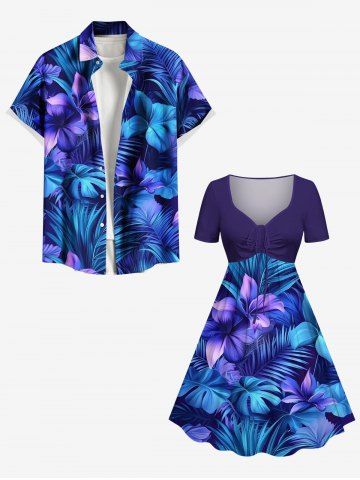 Flower Leaf Tropical Print Plus Size Matching Hawaii Beach Outfit For Couples
