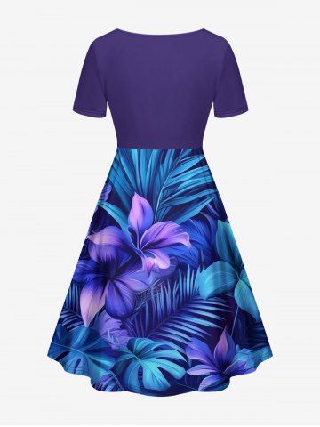 Plus Size Flower Leaf Tropical Print Cinched Hawaii Dress - Blue - 5x