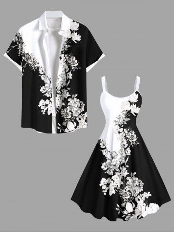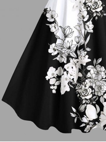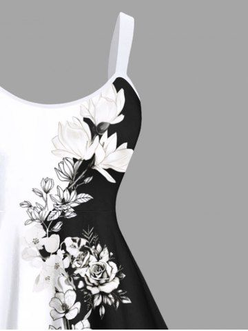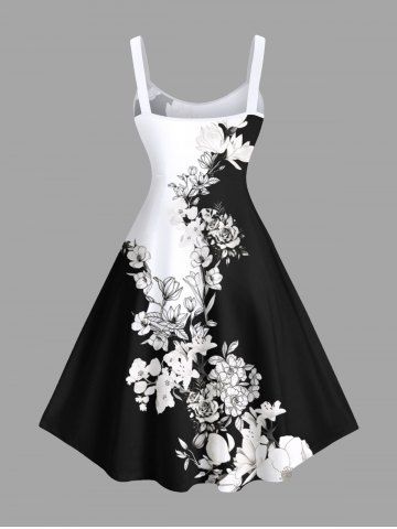 Plus Size Flower Leaf Two Tone Colorblock Print Hawaii Tank Dress - Black - L