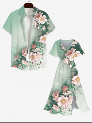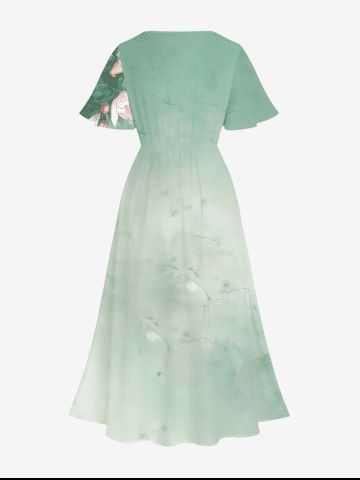 Plus Size Flower Leaves Sea Waves Print Hawaii Ombre Split Pocket A Line Midi Dress - Green - S