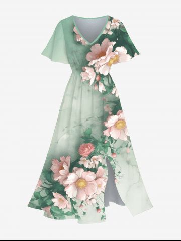 Plus Size Flower Leaves Sea Waves Print Hawaii Ombre Split Pocket A Line Midi Dress - Green - L