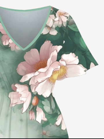 Plus Size Flower Leaves Sea Waves Print Hawaii Ombre Split Pocket A Line Midi Dress - Green - 6x