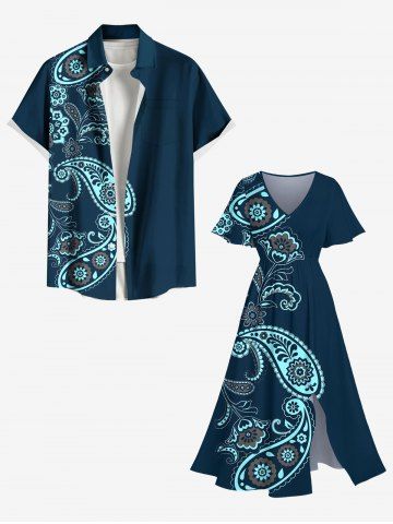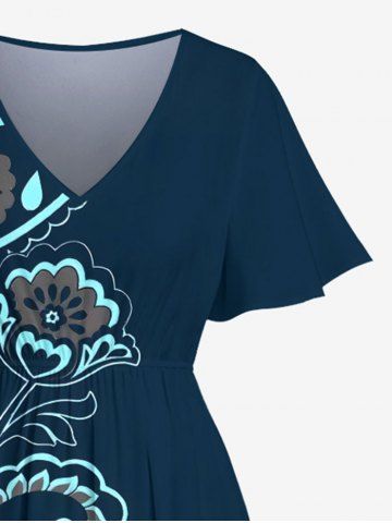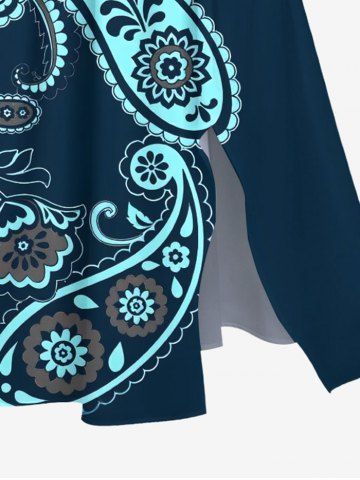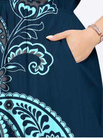 Plus Size Flower Paisley Print Hawaii Split Pocket A Line Midi Dress - Deep Blue - 1x