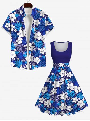 Plus Size Flower Palm Leaf Print Hawaii 1950s Vintage Dress - Blue - L