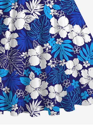 Plus Size Flower Palm Leaf Print Hawaii 1950s Vintage Dress - Blue - 5x