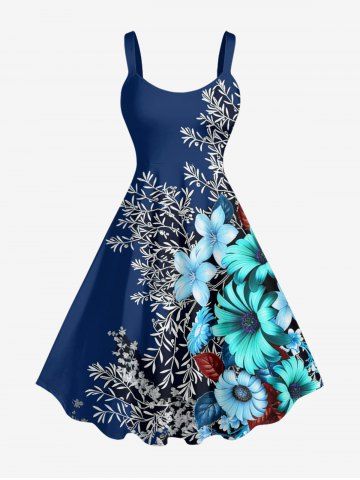 Plus Size Flower Plant Branch Print Hawaii A Line Dress - Deep Blue - 2x