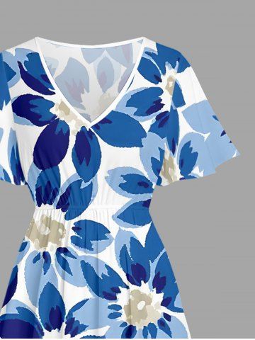 Plus Size Flower Print Hawaii Split Pocket A Line Midi Dress - Deep Blue - 3x