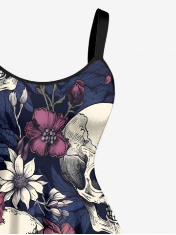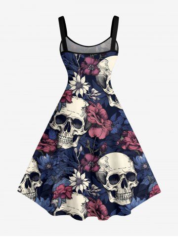 Plus Size Flower Skull Print Hawaii A Line Dress - Deep Blue - Xs