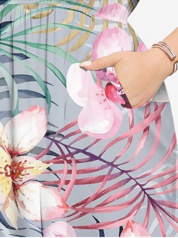 Plus Size Flower Tropical Leaf Print Split Hawaii Midi Dress - Dark Gray - M