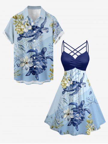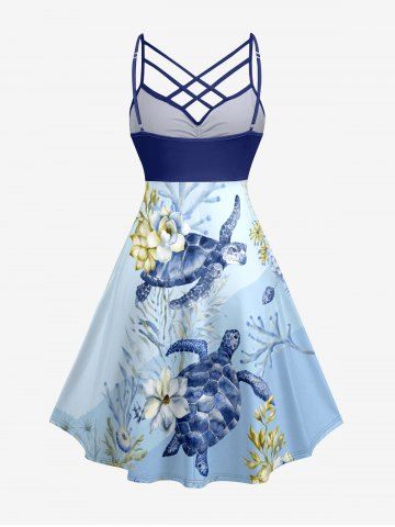 Plus Size Flower Turtle Coral Print Hawaii Sea Creatures Ruched Crisscross Strappy A Line Cami Dress - Light Blue - Xxs