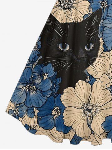 Plus Size Flowers Cat Print Hawaii 1950s Vintage Dress - Blue - 5x