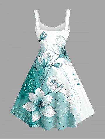 Plus Size Flowers Colorblock Watercolor Print Hawaii Tank Dress - Dark Turquoise - 3x