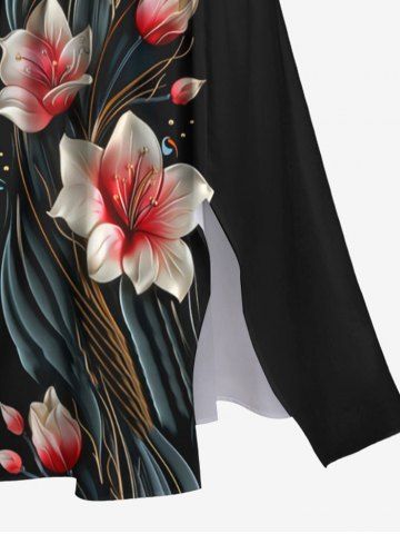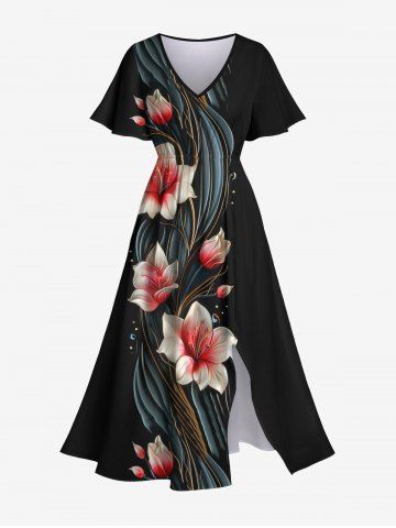 Plus Size Flowers Curve Light Beam 3D Print Split Hawaii Midi Dress - Black - Xs
