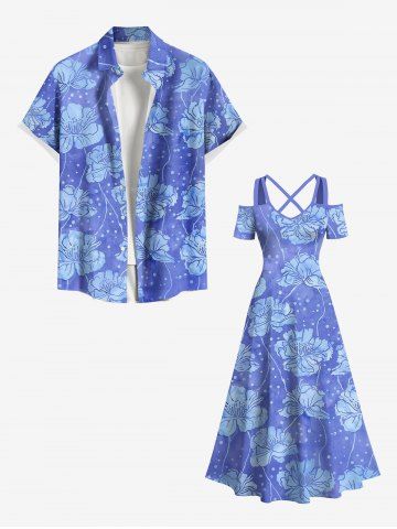 Plus Size Flowers Dots Print Cold Shoulder Crisscross Hawaii Maxi Dress - Blue - S