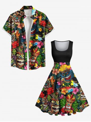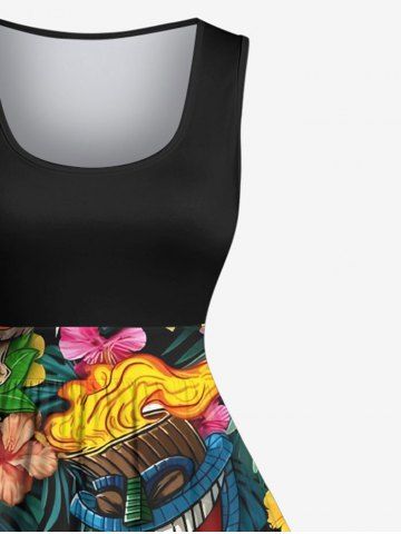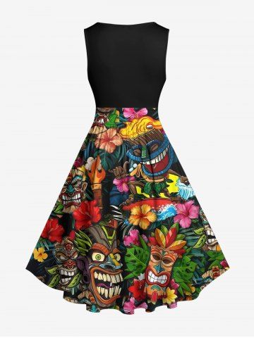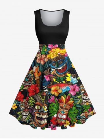 Plus Size Flowers Fire Flame Mask Print Hawaii 1950s Vintage Dress - Black - S