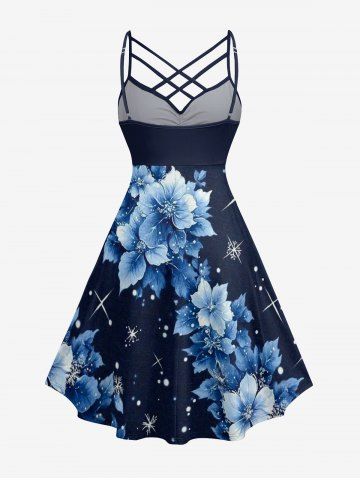 Plus Size Flowers Galaxy Glitter 3D Print Ruched Lattice Crisscross Straps Hawaii Dress - Deep Blue - 6x