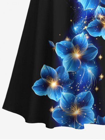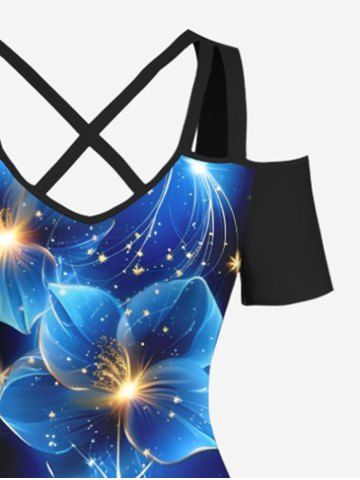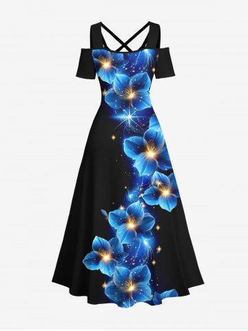 Plus Size Flowers Glitter 3D Print Cold Shoulder Crisscross Hawaii Maxi Dress - Black - L