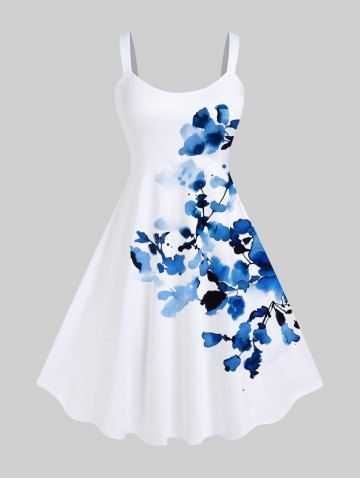 Plus Size Flowers Leaf Branch Watercolor Print Hawaii Tank Dress - White - Xs