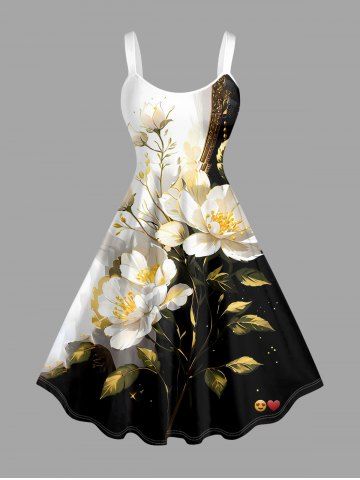 Plus Size Flowers Leaf Colorblock Print Hawaii Tank Dress - White - M