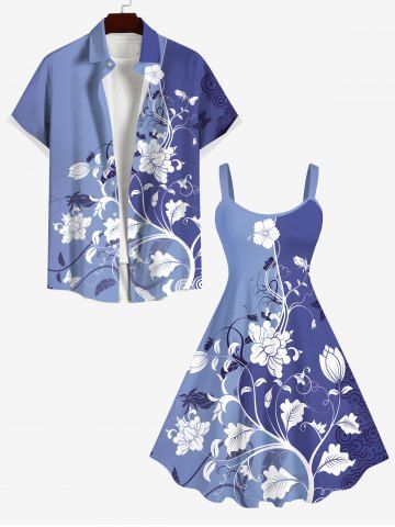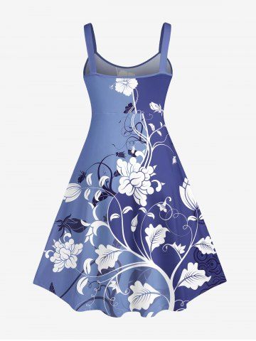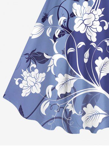 Plus Size Flowers Leaf Curve Colorblock Print Hawaii Tank Dress - Blue - M