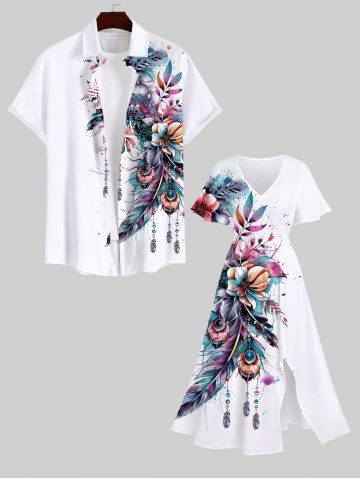 Plus Size Flowers Leaf Feather Tassel Paint Splatter Print Split Hawaii Midi Dress - White - 4x